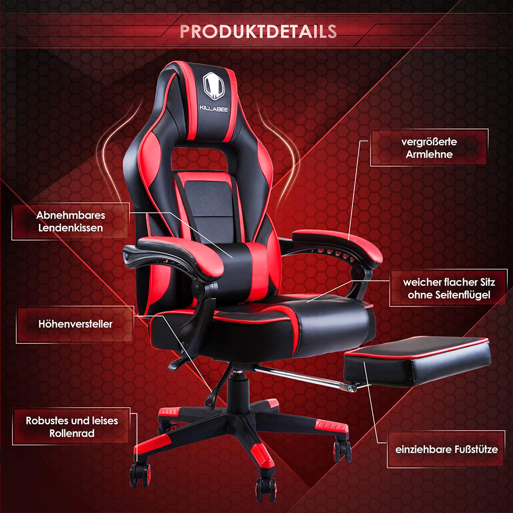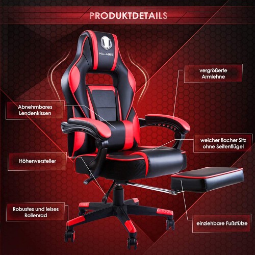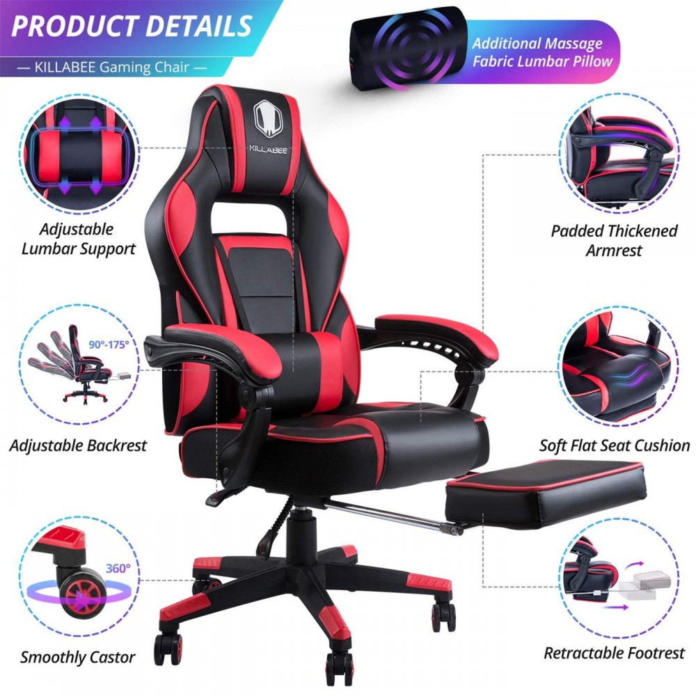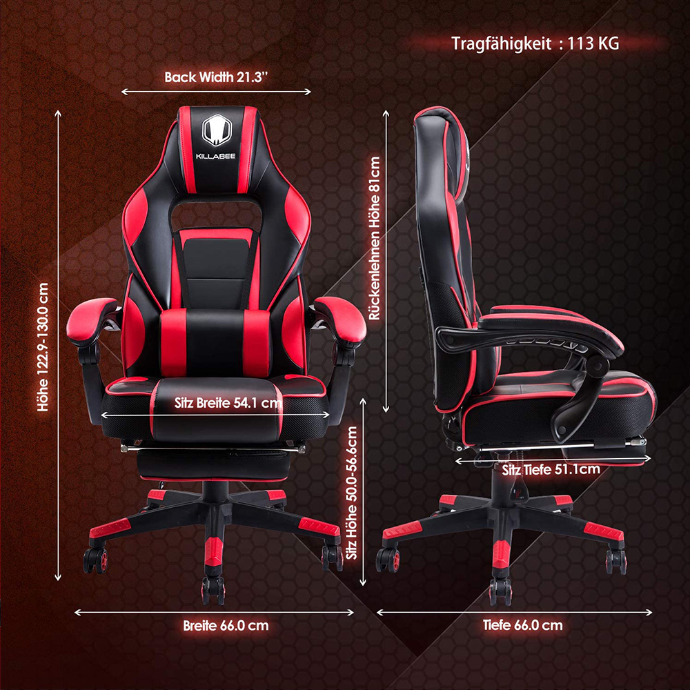 Stolica KILLABEE 9015 pruža visok nivo udobnosti zahvaljujući kvalitetnoj PU koži, izlivenom modularnom sunđeru, podesivom naslonu za leđa od 90° do 175°, kao i lumbalnom jastuku sa vibracionim masažerom. Dodatnu udobnost obezbeđuju integrisana potpora za vrat, tapacirani rukonasloni i izvlačna potpora za noge. Stolica je predviđena za opterećenje do 113 kg.