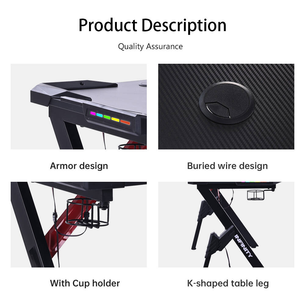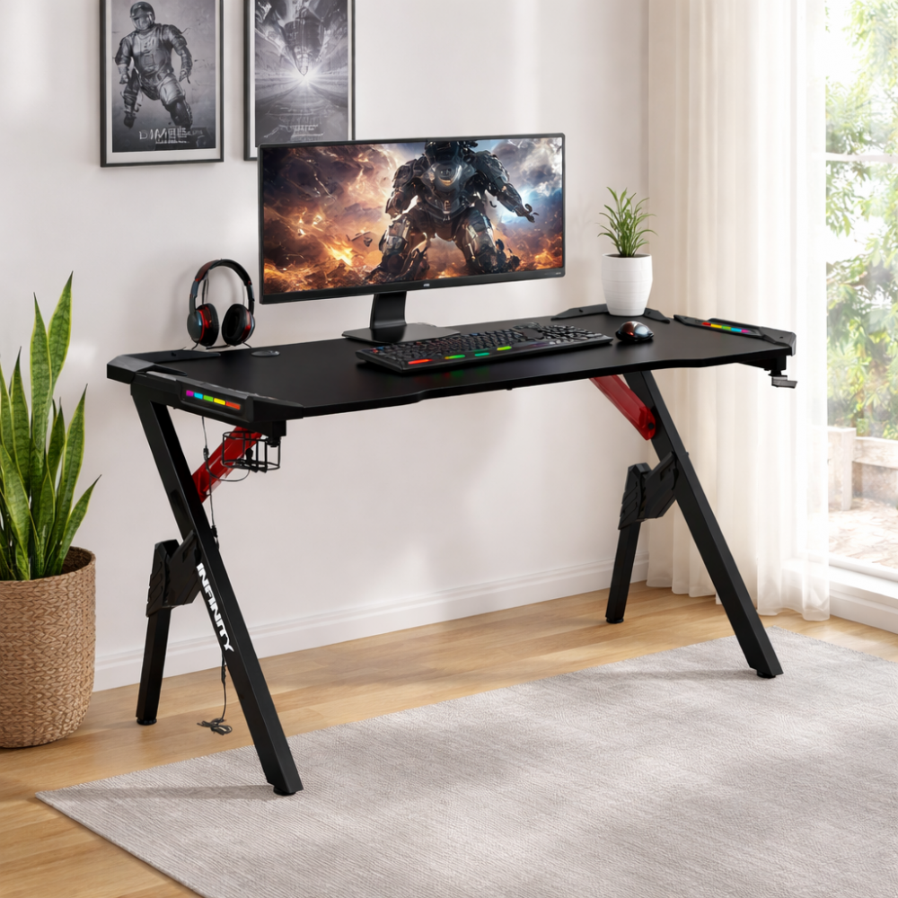 Sto Infinity GT20 Red odlikuje se čvrstom i masivnom konstrukcijom, ergonomskom radnom površinom i integrisanim LED RGB osvetljenjem koje dodatno unapređuje atmosferu prostora. Radna ploča sa karbonskim izgledom, sistem za provlačenje kablova, kao i držač za čašu i slušalice pružaju urednost i praktičnost u svakodnevnom korišćenju.