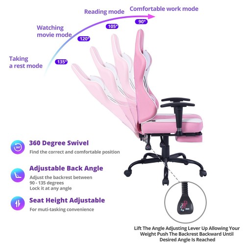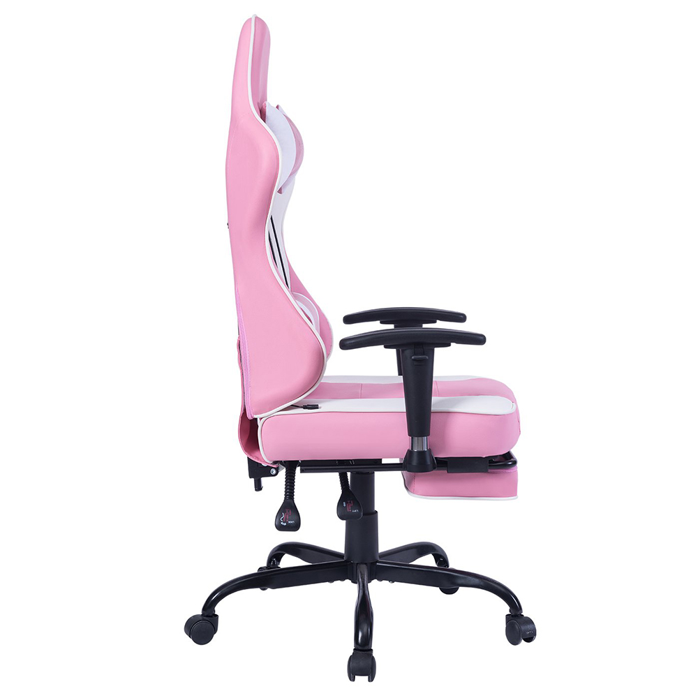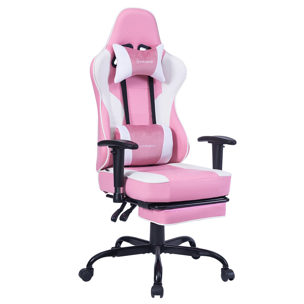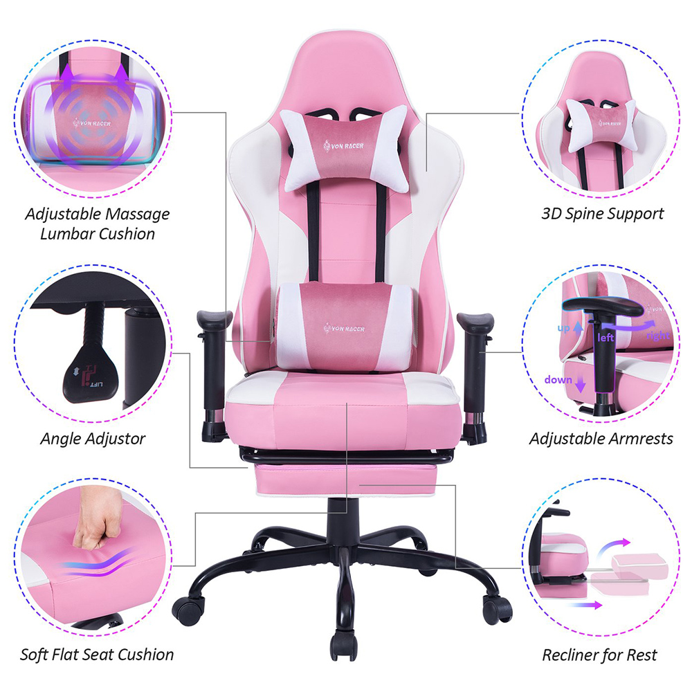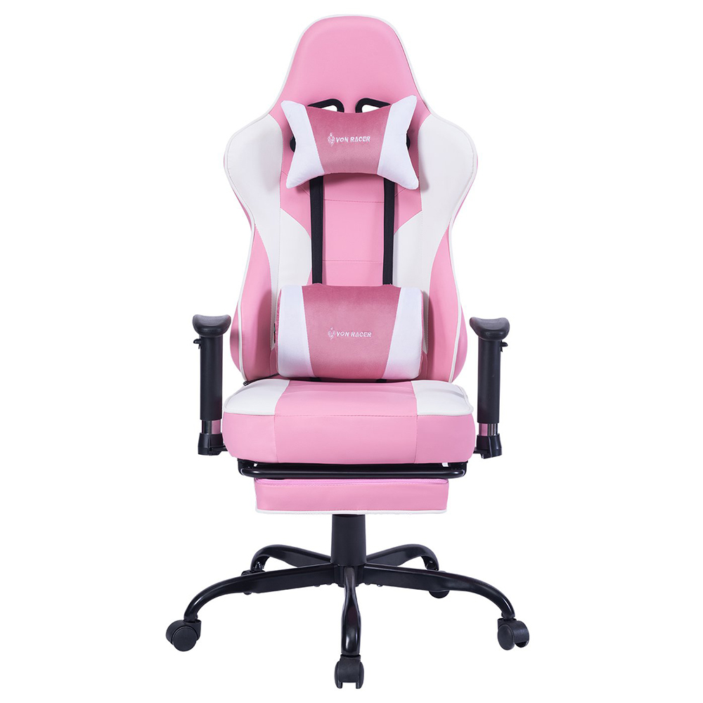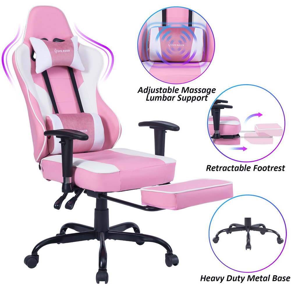 Gejmerska stolica VON Racer 8280 u rozoj-beloj kombinaciji boja sa vibracionim lumbalnim masažerom.